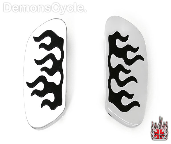 Beautifully chromed floorboards with flame rubber inserts that fit FLT and FLST Harley models.
